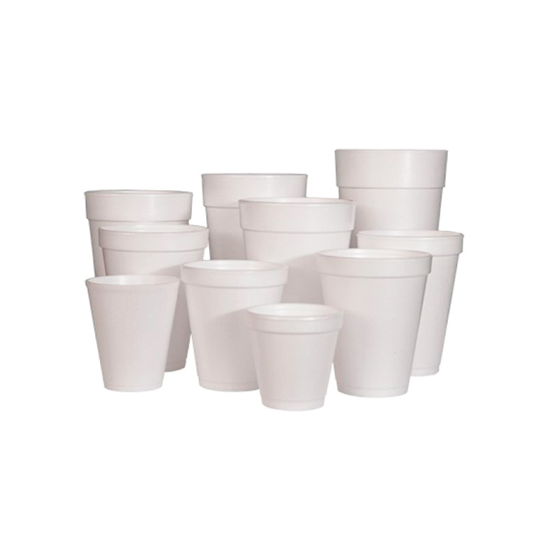 Vasos plásticos transparentes y blancos en diferentes tamaños.