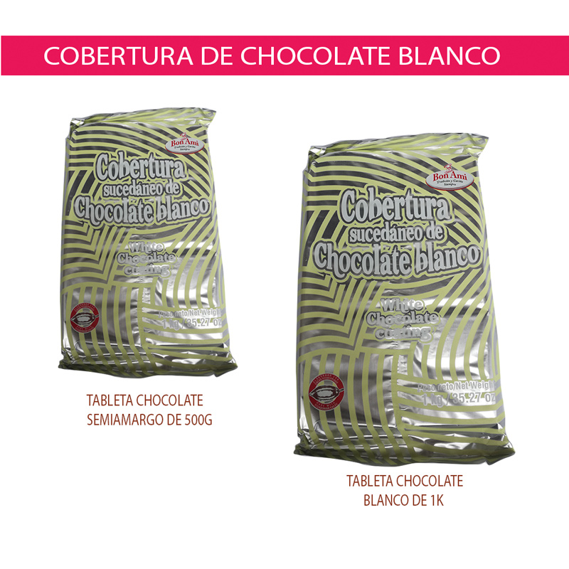 Tabletas de chocolate blanco semiamargo de 500 gramos y 1 kilo.