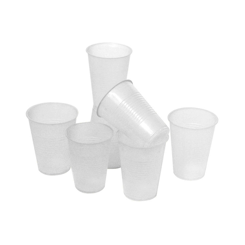 Vasos plásticos transparentes y blancos en diferentes tamaños.